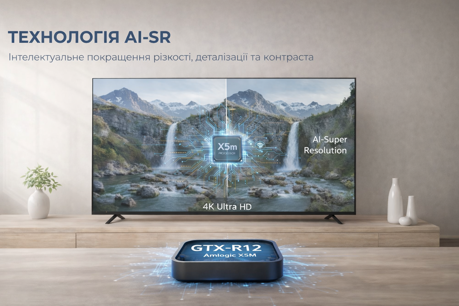 GEOTEX GTX-R12 — це сучасний медіаплеєр, що поєднує потужне технічне наповнення та інтелектуальні відеотехнології. Приставка працює на базі Amlogic S905X5M та оснащена технологією AI-Super Resolution (AI-SR), яка покращує якість зображення в HD та SD форматах, роблячи картинку ще чіткішою та деталізованішою.